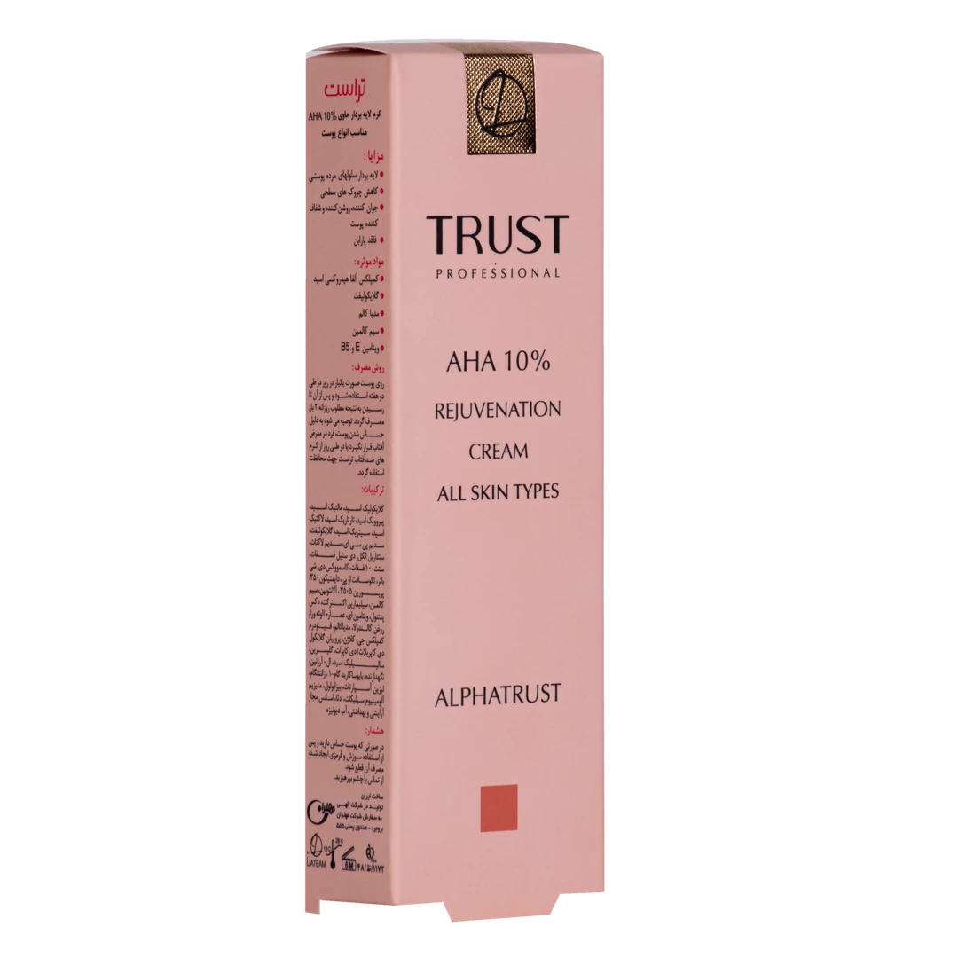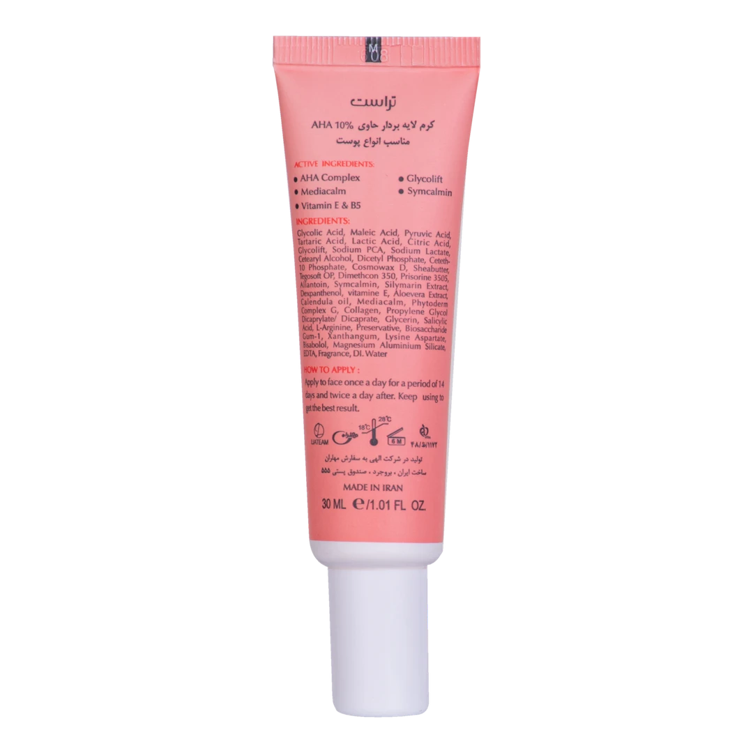 کرم لایهبردار تراست حاوی 10 درصد آلفا هیدروکسی با لایهبرداری سلولهای پیر و فرسوده، قدرت بازسازی پوست را به آن بازمیگرداند تا علاوه بر کم شدن میزان چینوچروکهای سطحی، پوستی یکدست، شفاف، جوان و روشن پیدا کنید.