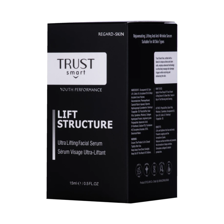 روش مصرف: سرم لیفت تراست اسمارت را روزانه دو بار صبح و شب روی پوست تمیز صورت ماساژ دهید.